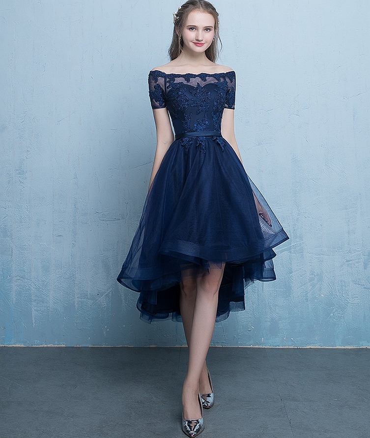 - Dark blue lace tulle short prom dress, high low evening dress -