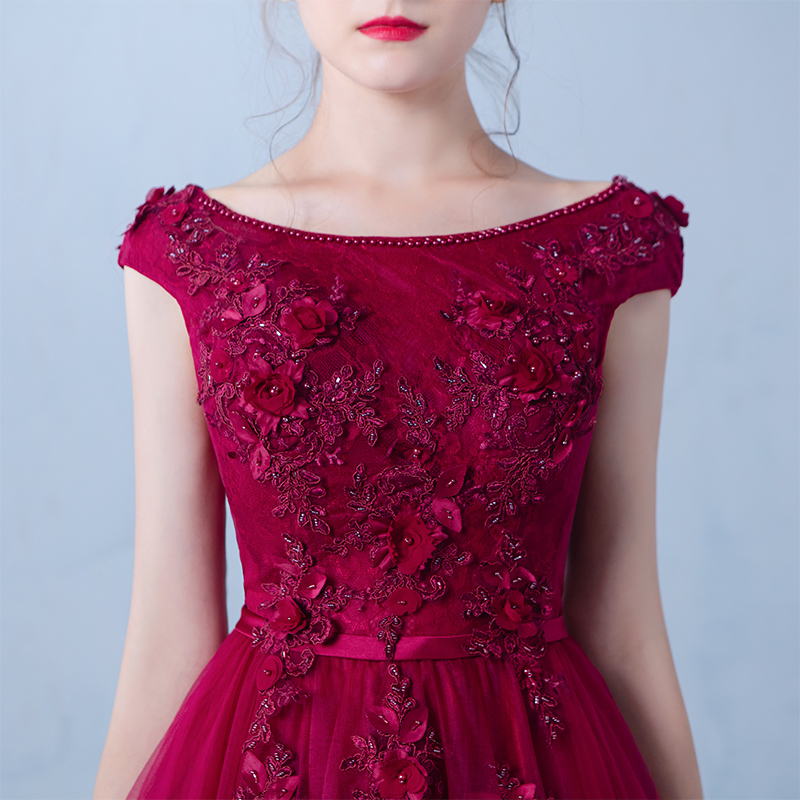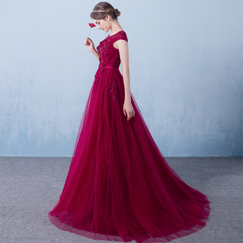 - Burgundy round neck tulle lace long prom dress, evening dress -