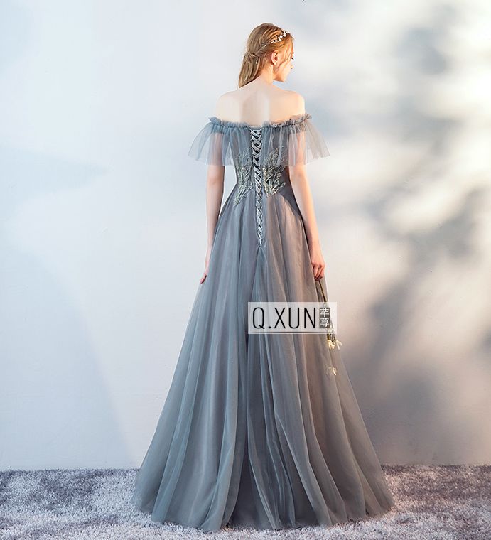 - Gray tulle lace long prom dress, gray evening dress -