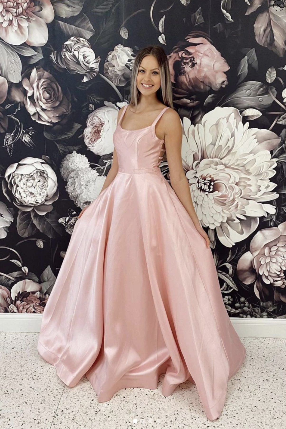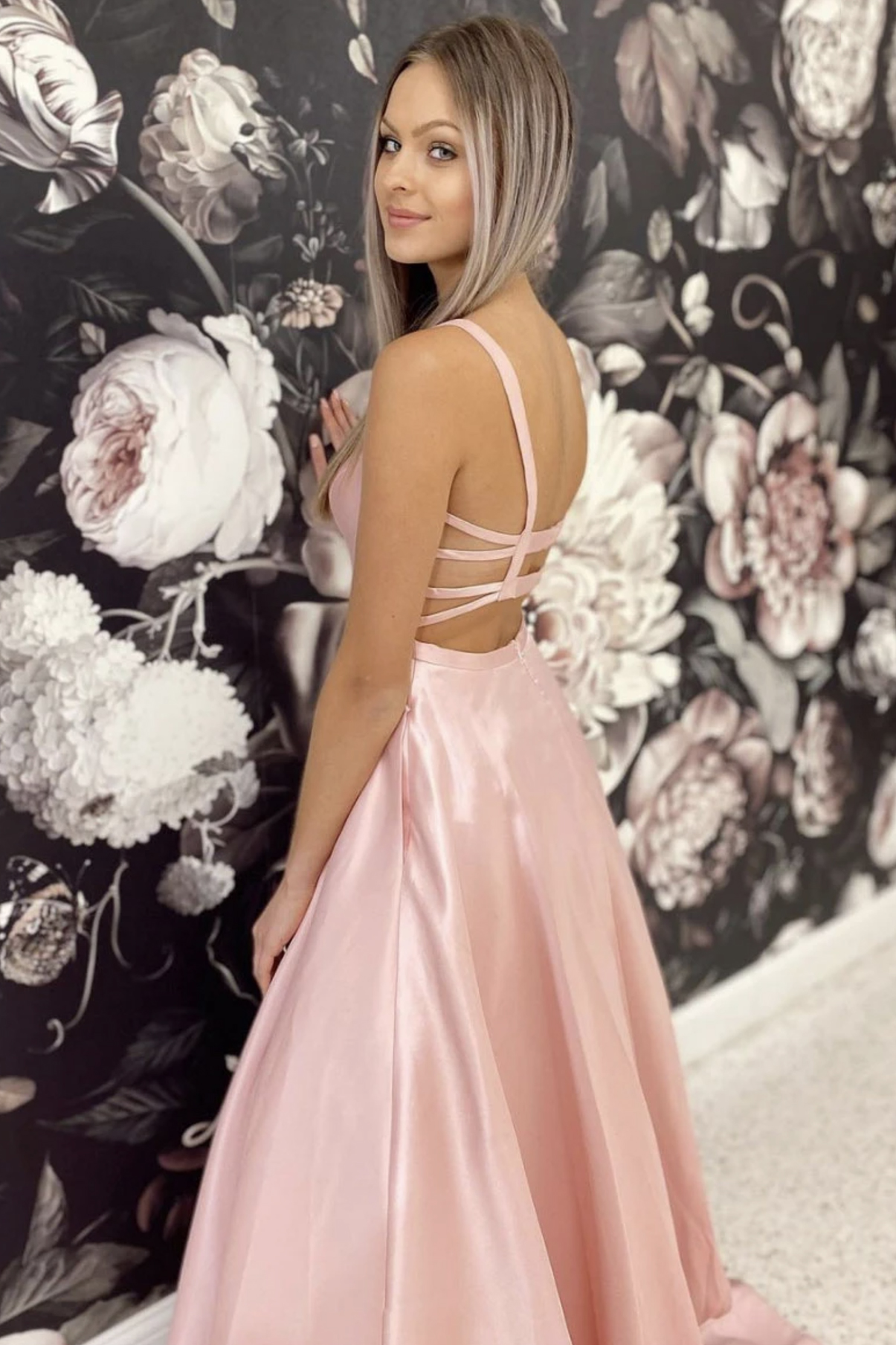- Pink satin long prom dress A line evening dress -