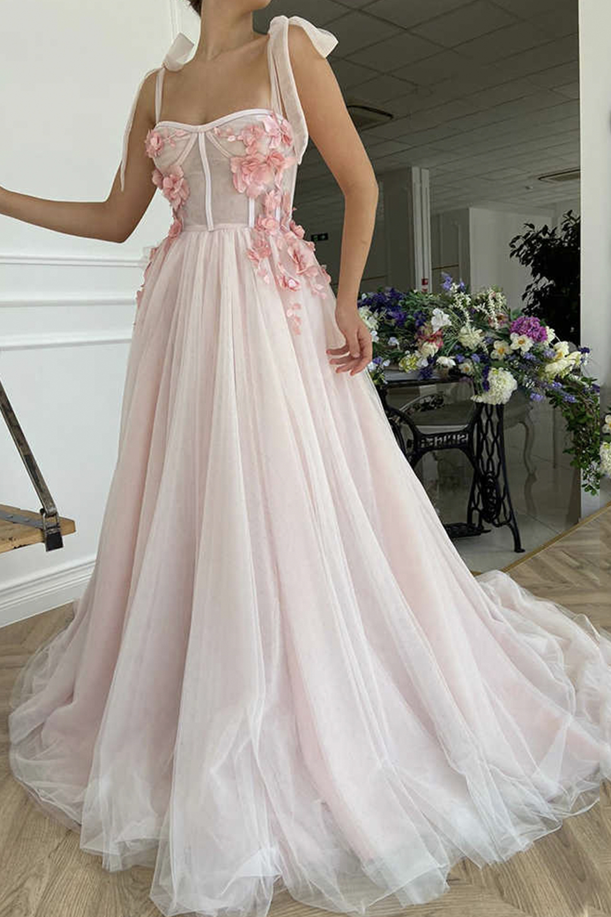 - Pink tulle applique long A line prom dress evening dress -