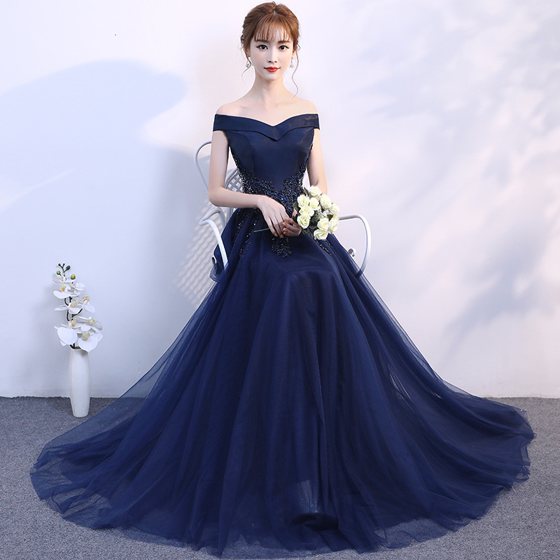 - Dark blue tulle lace off shoulder long prom dress, evening dress -