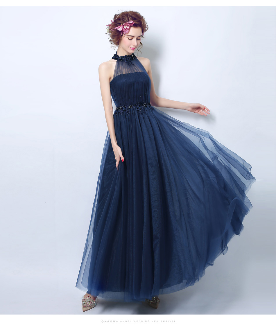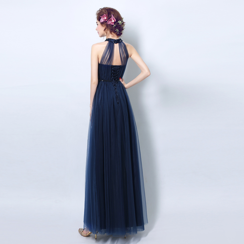 - Dark blue round neck tulle lace long prom dress, evening dress -