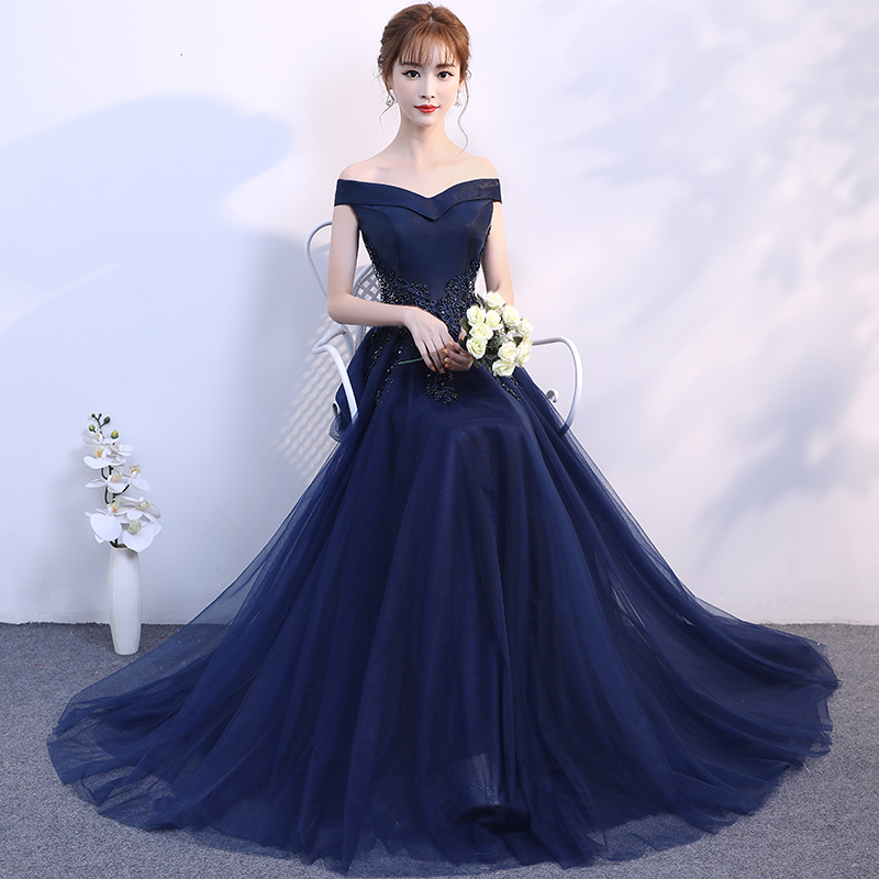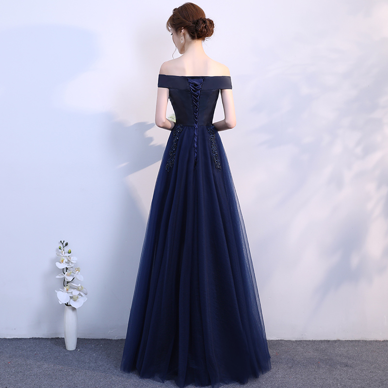 - Dark blue lace tulle off shoulder long prom dress, evening dress -