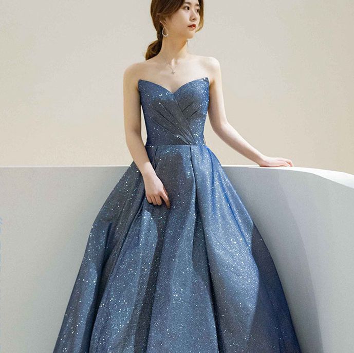- Dark blue satin long prom dress, evening dress -