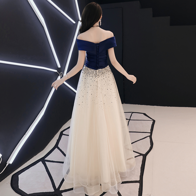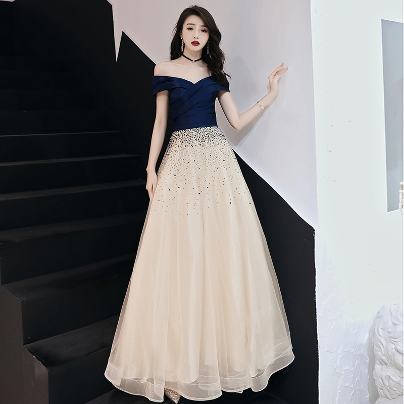 - Dark blue v neck off shoulder long prom dress, evening dress -
