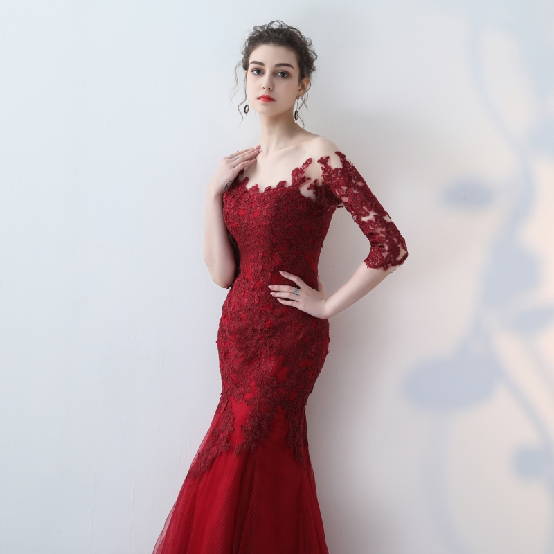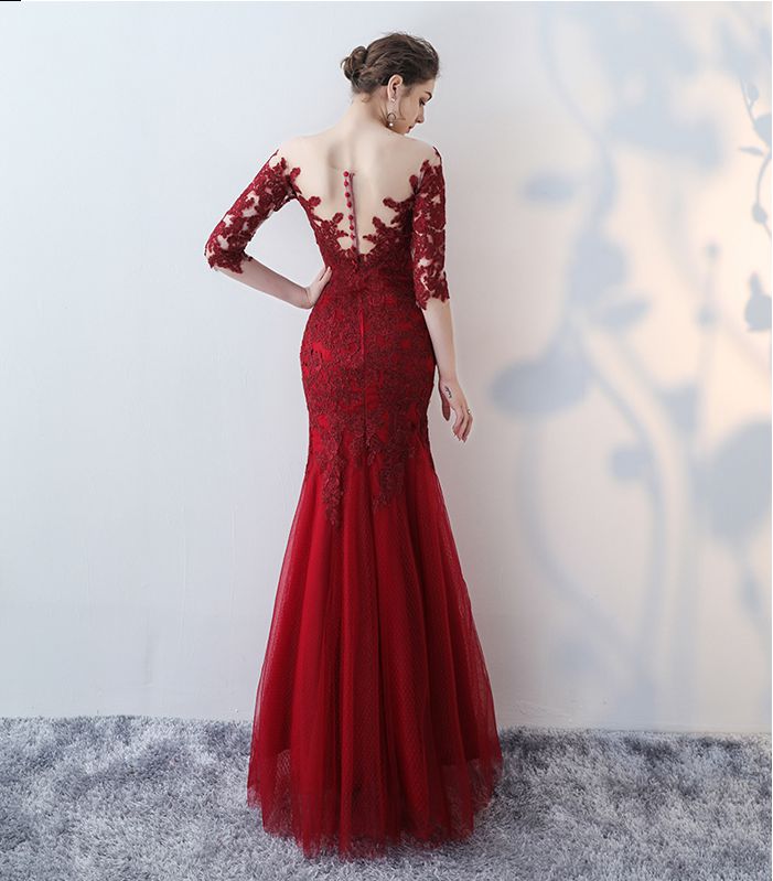 - Burgundy lace tulle long prom dress, long sleeve evening dress -