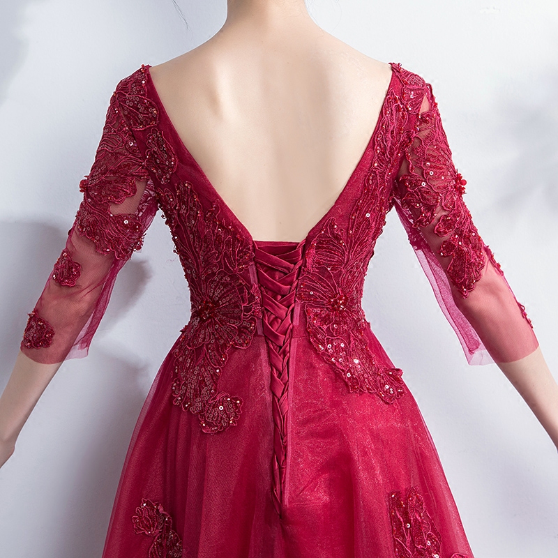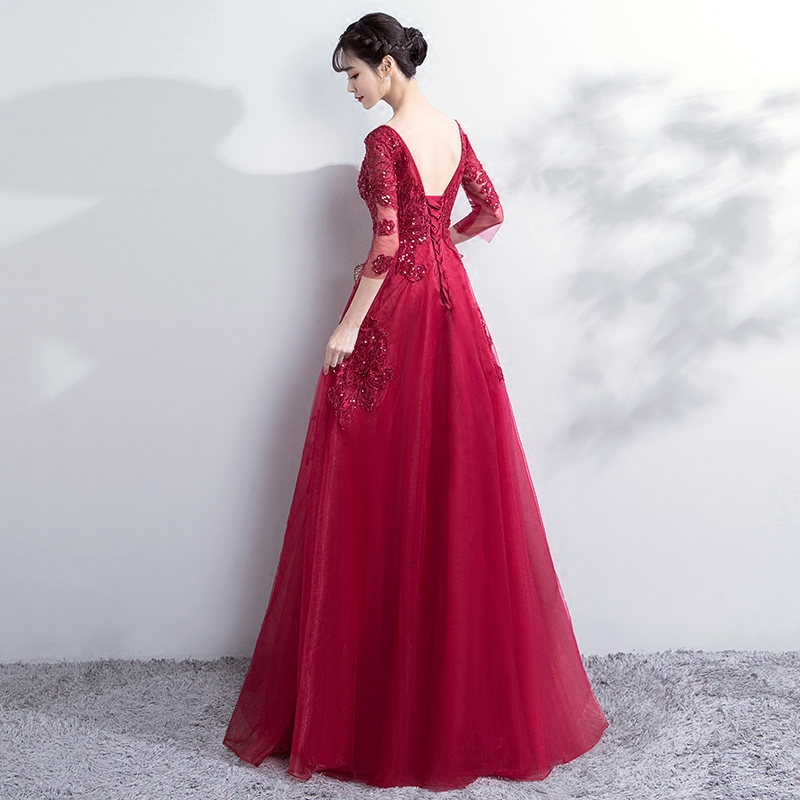 - Burgundy v neck tulle sequins long prom dress, formal dress -