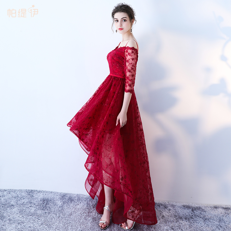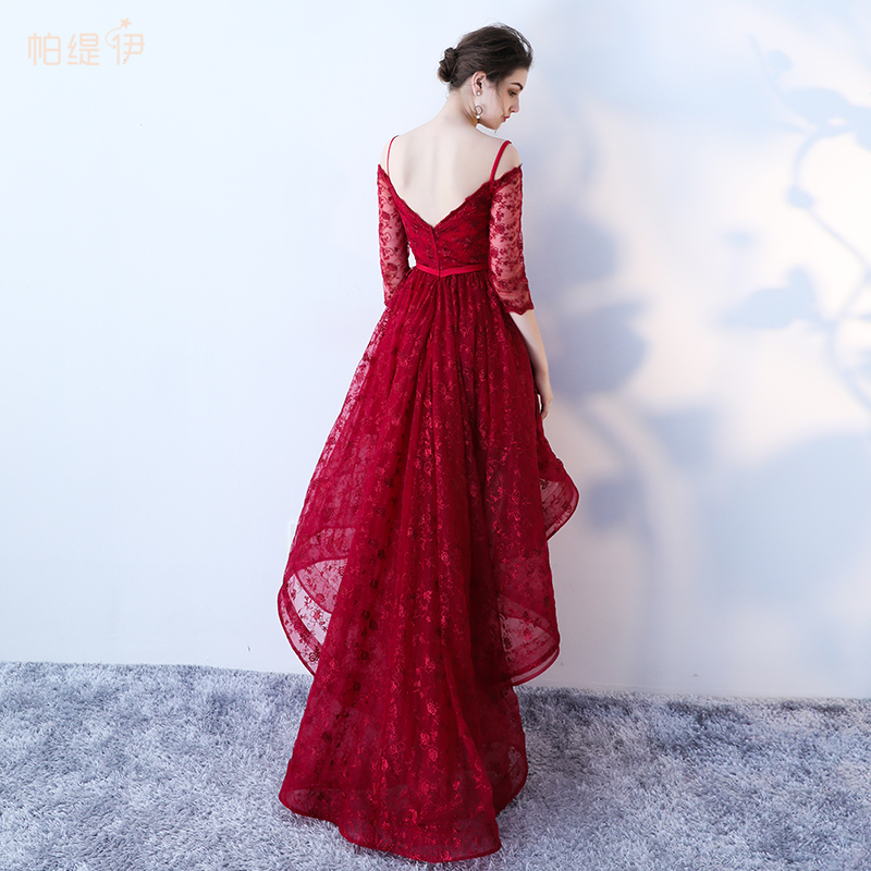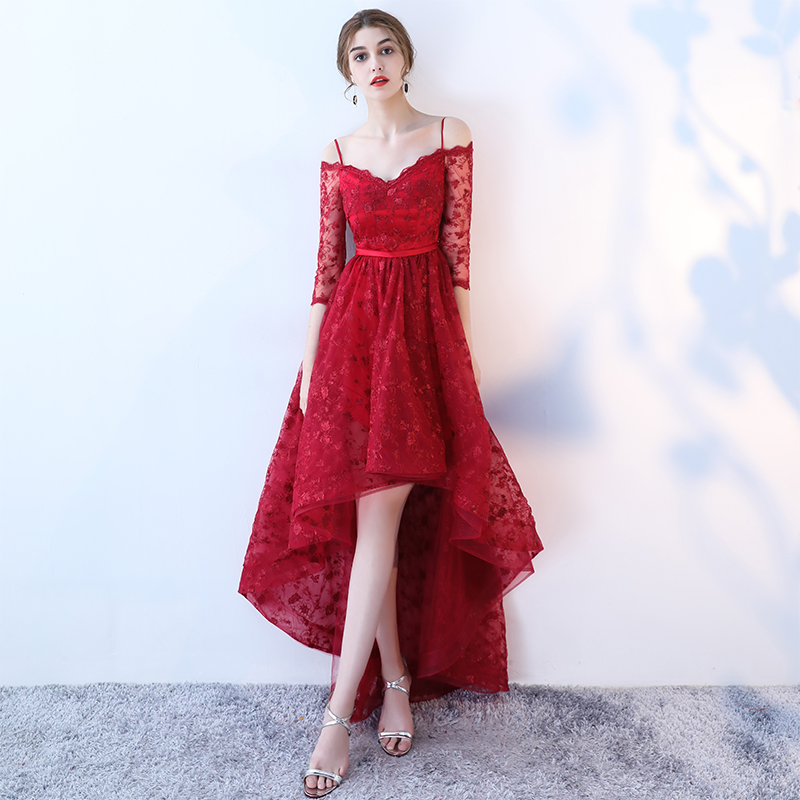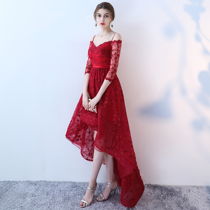 - Burgundy high low prom dress, lace evening dress -