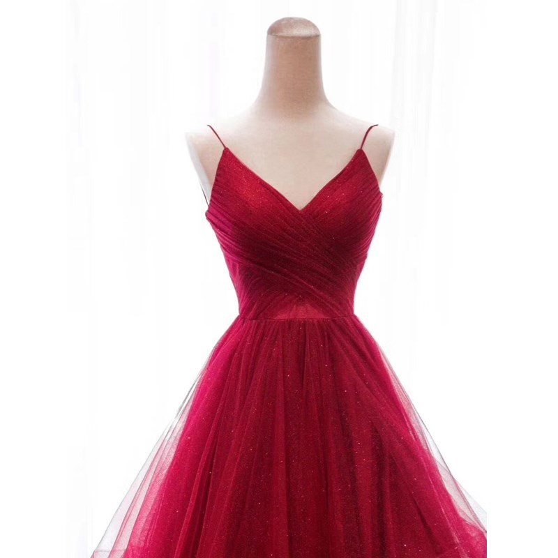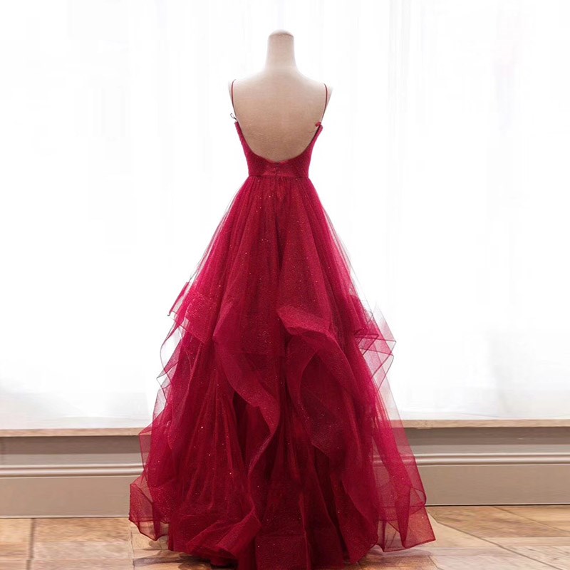 - Shiny burgundy v neck tulle long prom dress, evening dress -