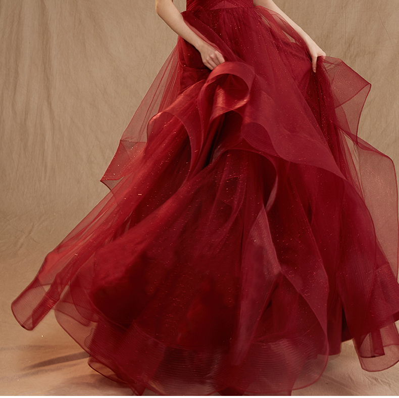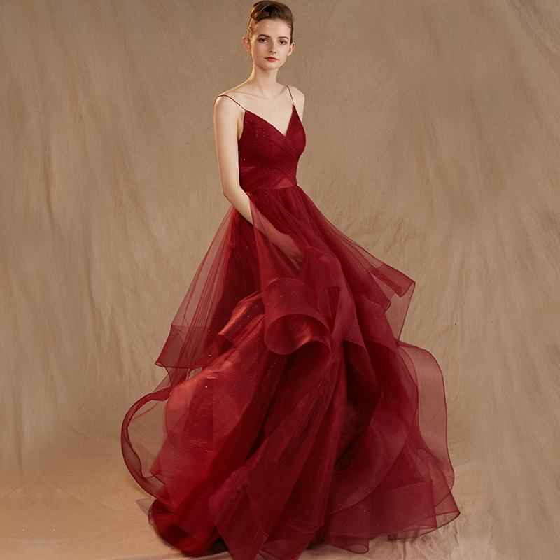 - Burgundy v neck tulle long prom gown, formal dress -