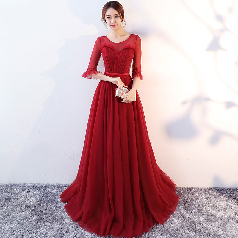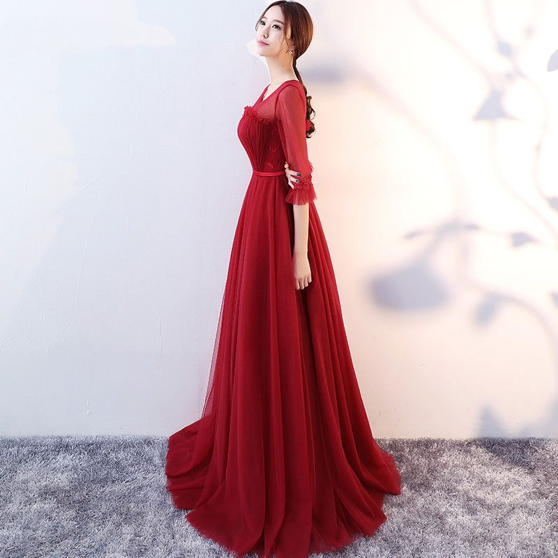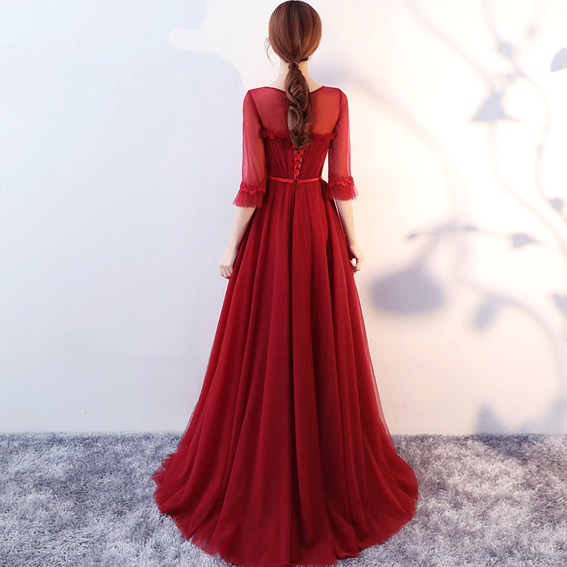 - Burgundy tulle long prom dress, burgundy evening dress -