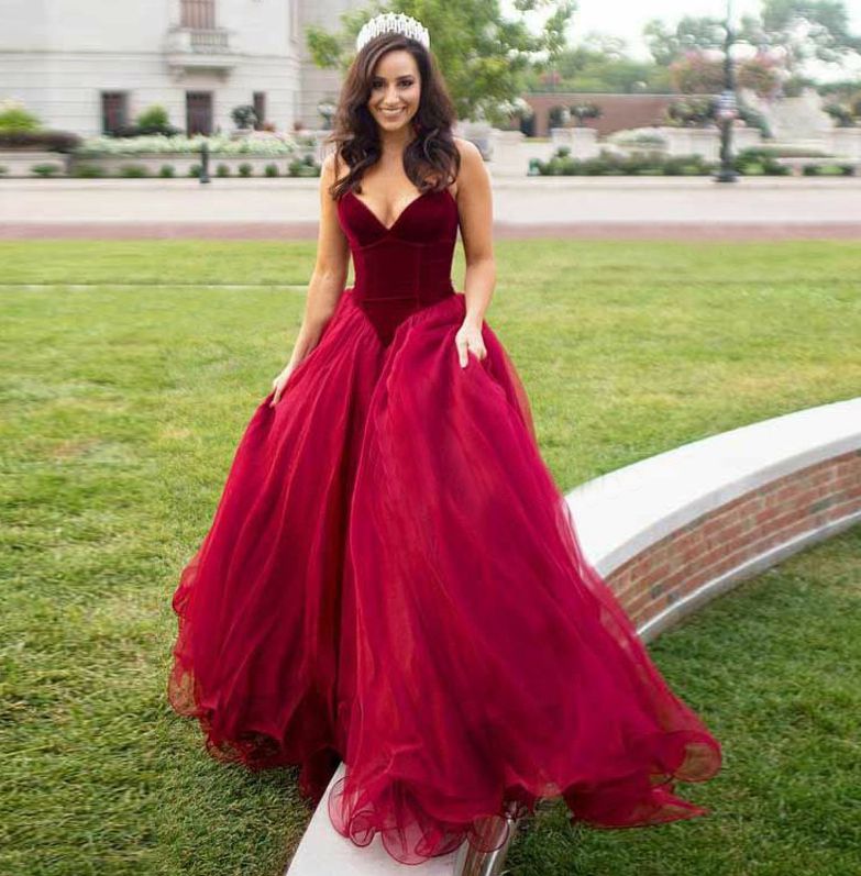 - Burgundy v neck velvet tulle long prom dress, princess dress -