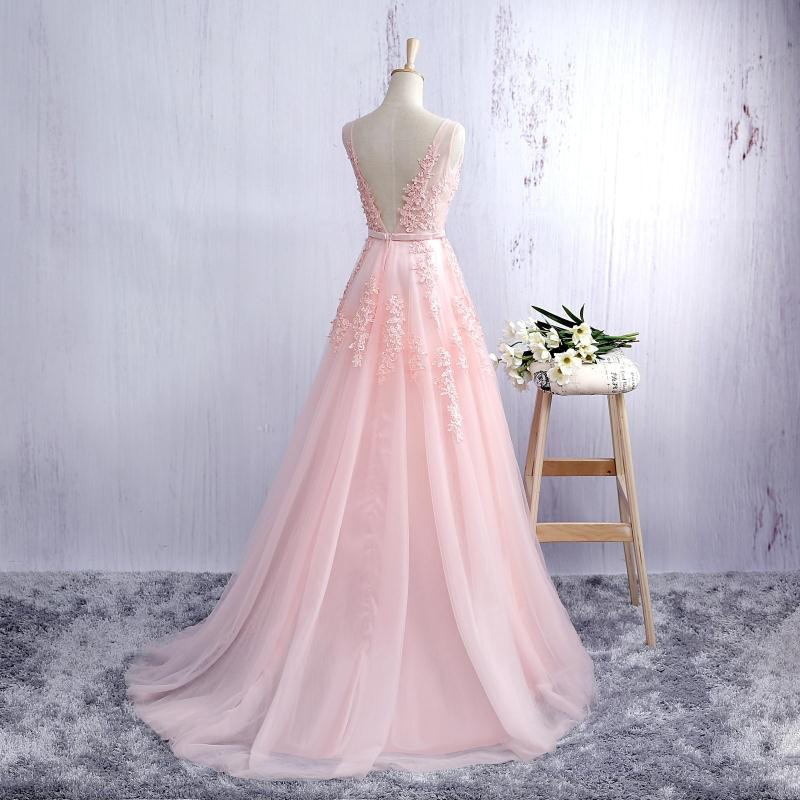 - Pink v neck tulle lace long prom dress -