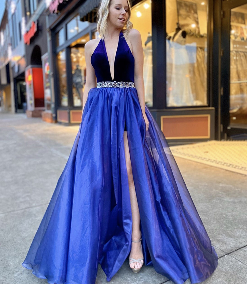 - Blue velvet tulle long prom dress evening dress -