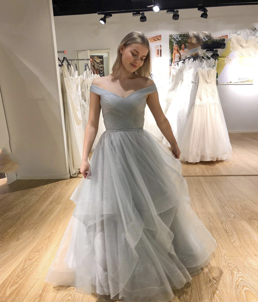 - Gray tulle long prom dress evening dress -