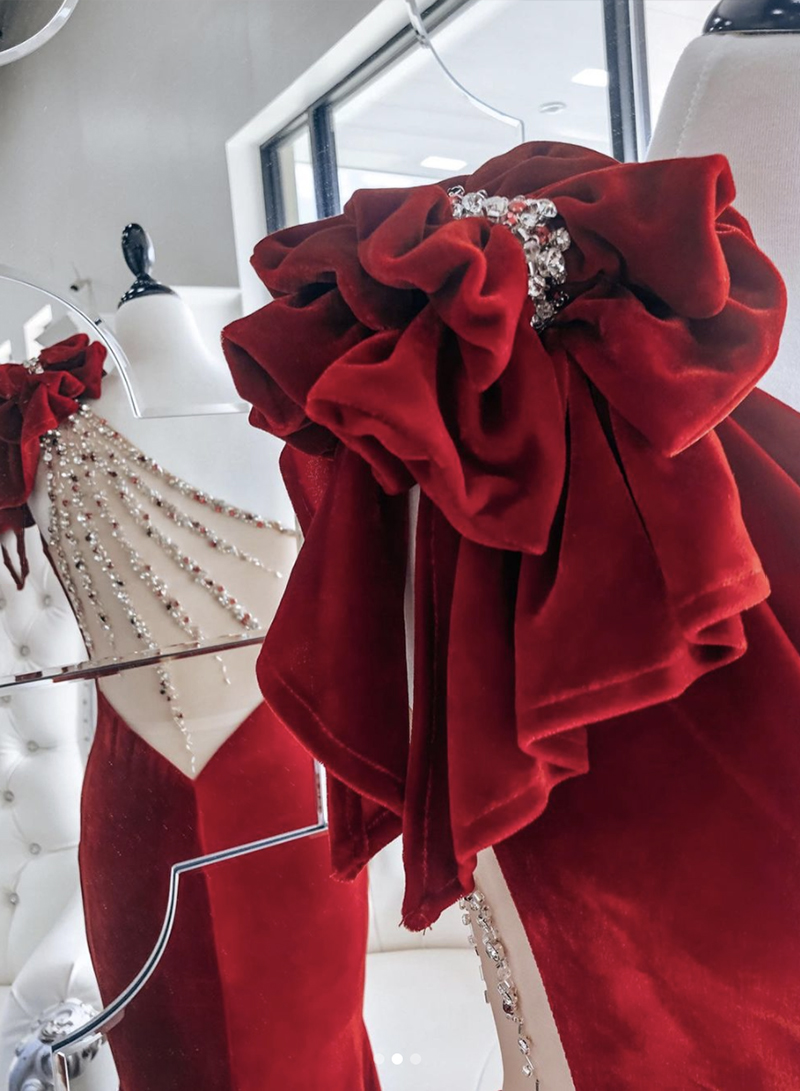 - Red velvet long prom dress one shoulder evening dress -