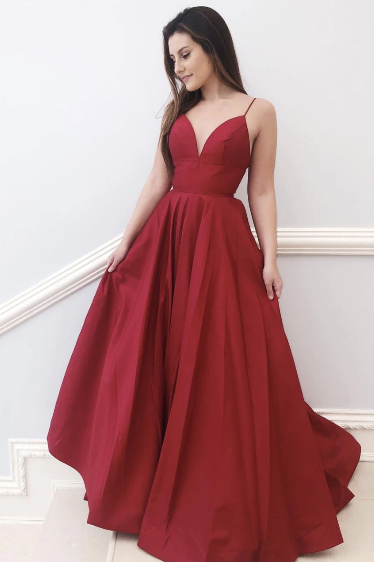 - Red v neck long A line prom dress red evening dress -
