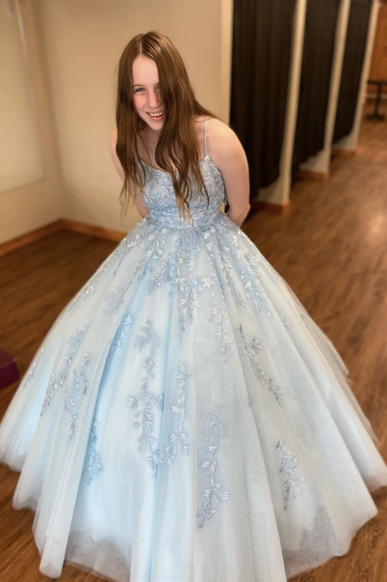 - Blue tulle lace long A line prom dress evening dress -