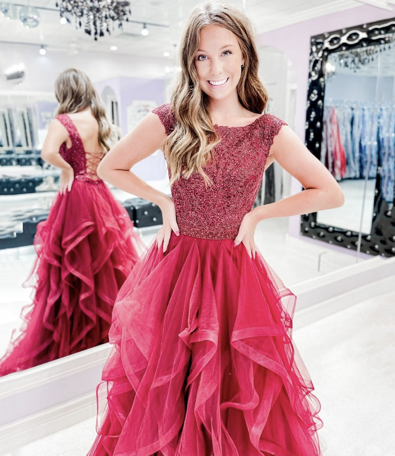 - Red tulle lace long prom dress A line evening gown -