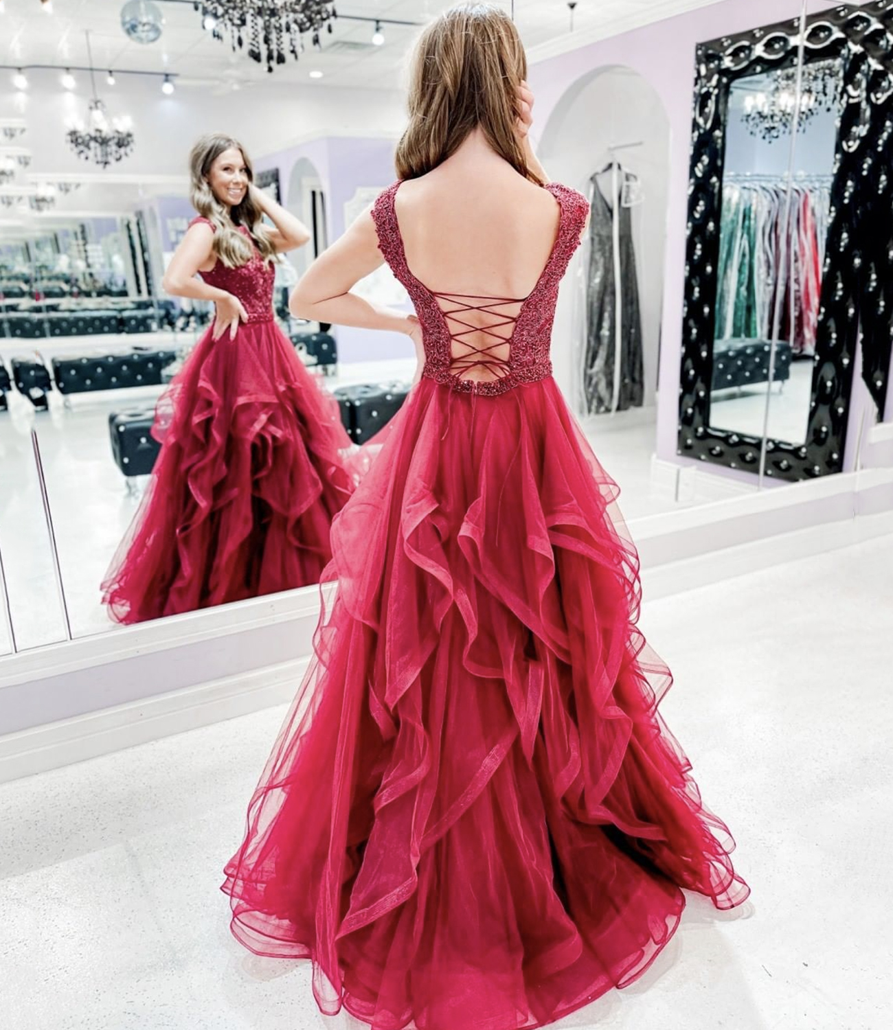 Red tulle lace long prom dress A line evening gown