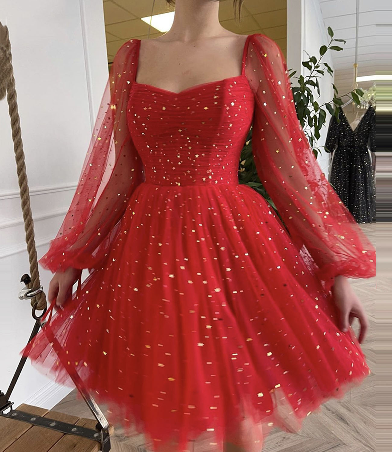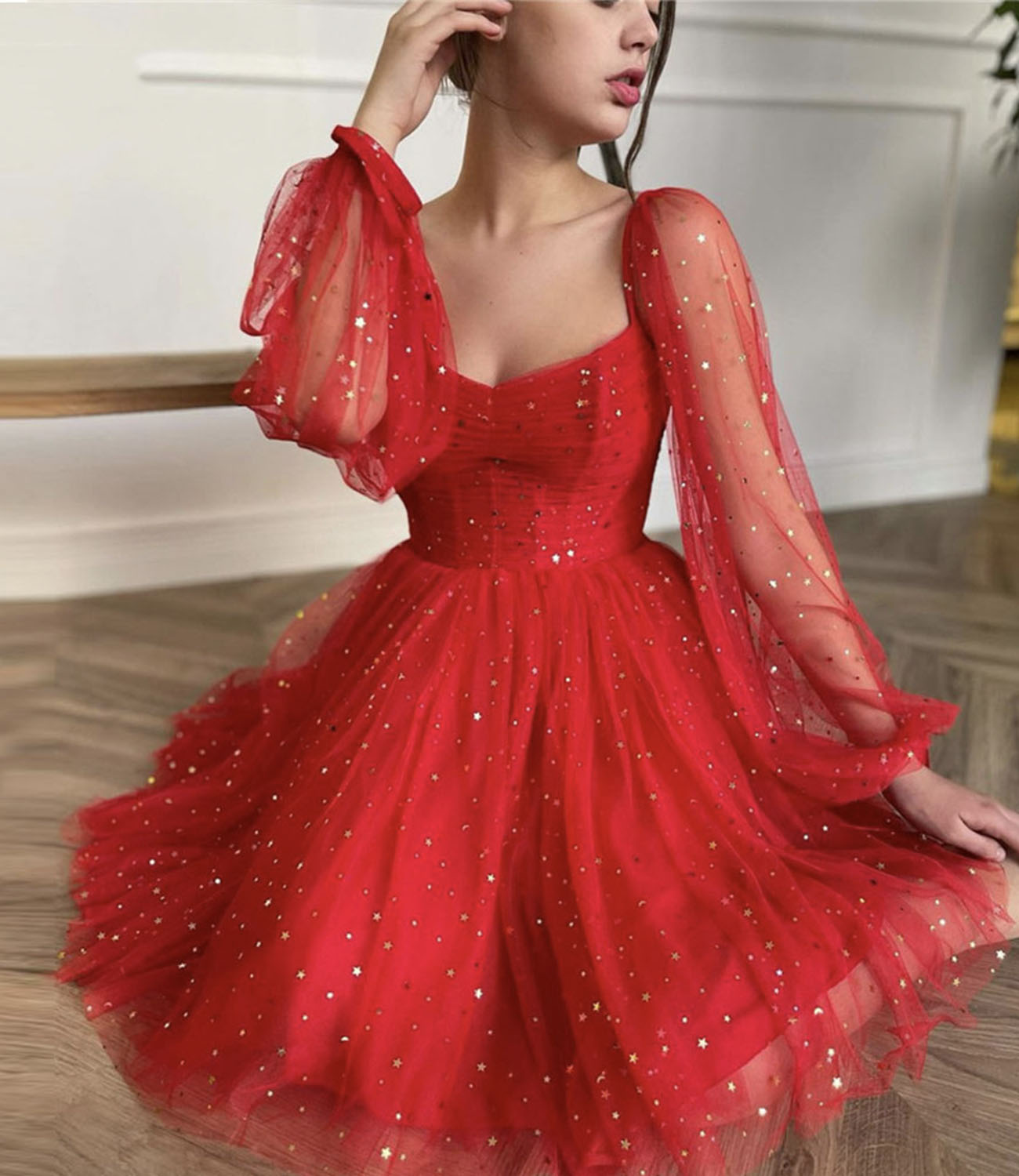 - Red tulle long sleeve prom dress homecoming dress -