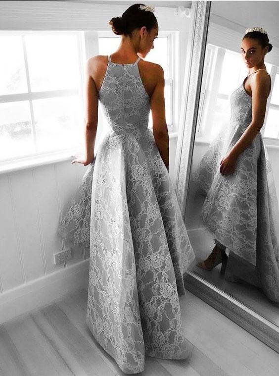 - Stylish gray lace high low prom dress, gray lace evening dress -