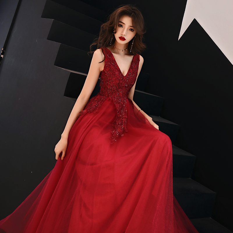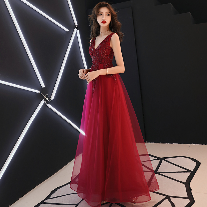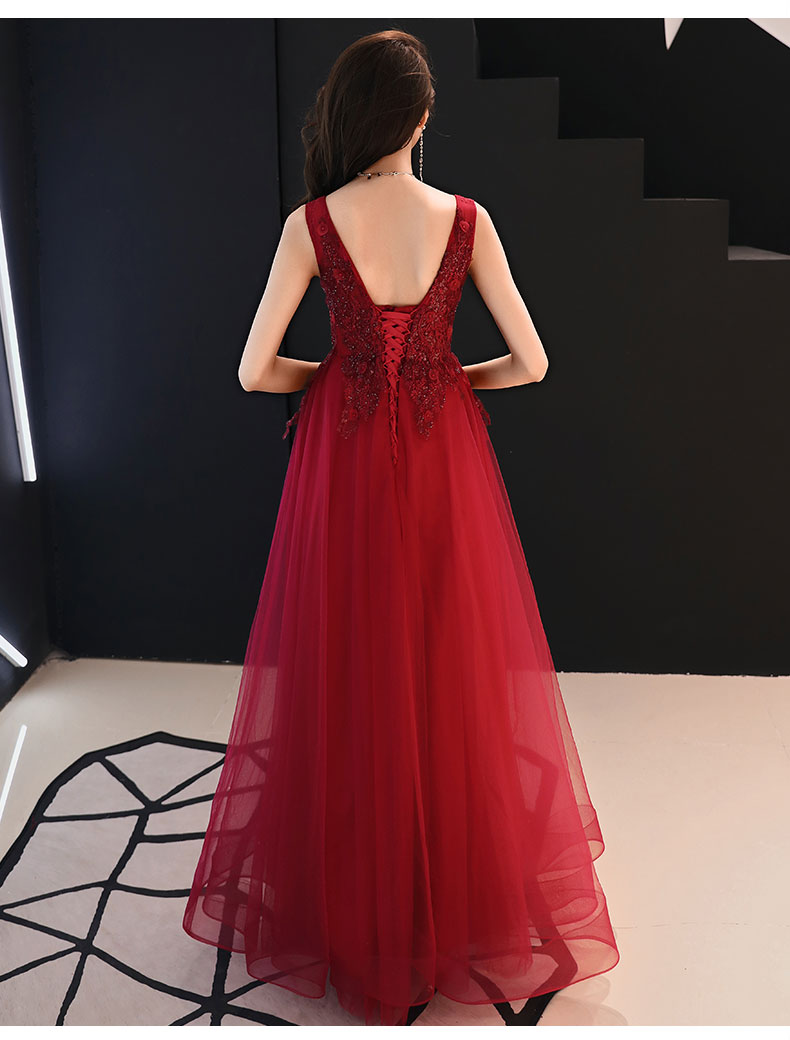 - Burgundy v neck lace tulle long prom dress, burgundy evening dress -