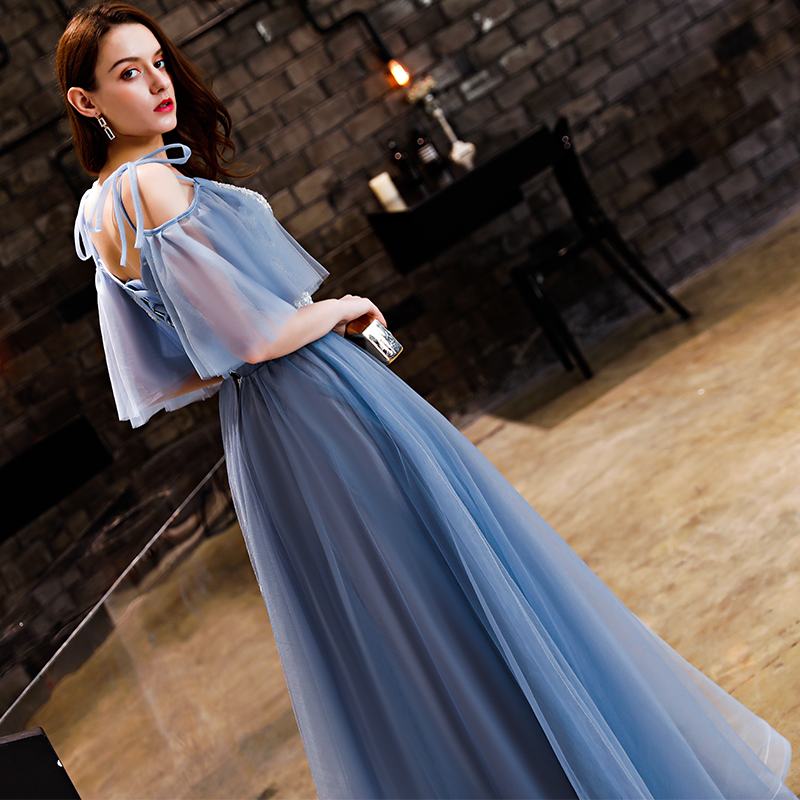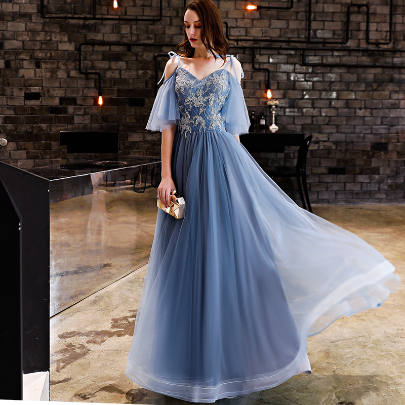 - Blue tulle lace long prom dress, lace evening dress -