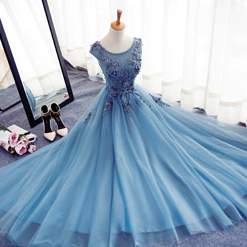 - Blue round neck tulle lace long prom dress, evening dress -