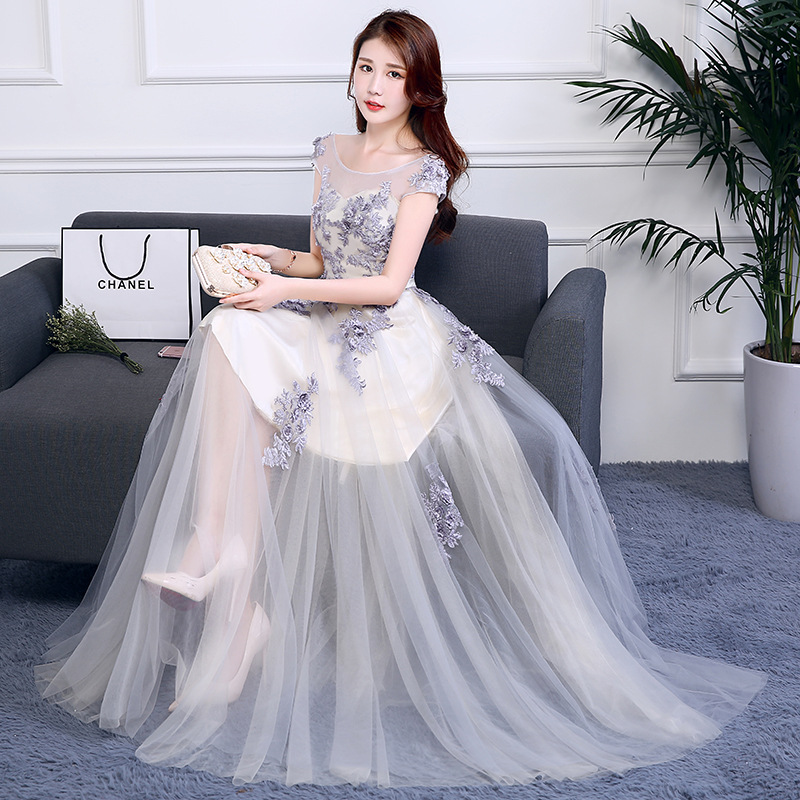 - Stylish champagne tulle lace long prom dress, lace evening dress -