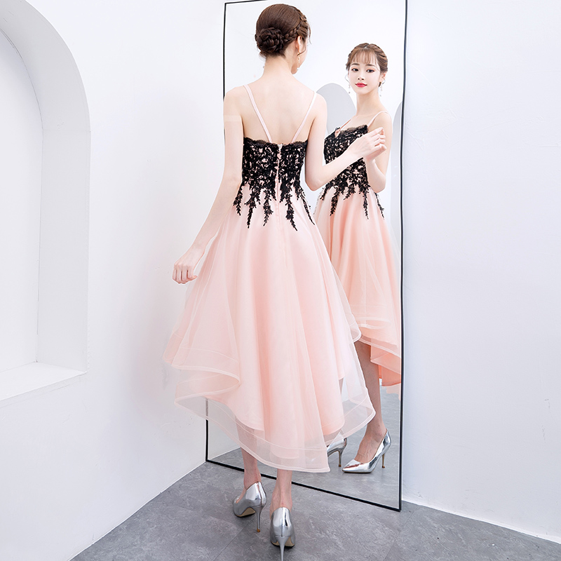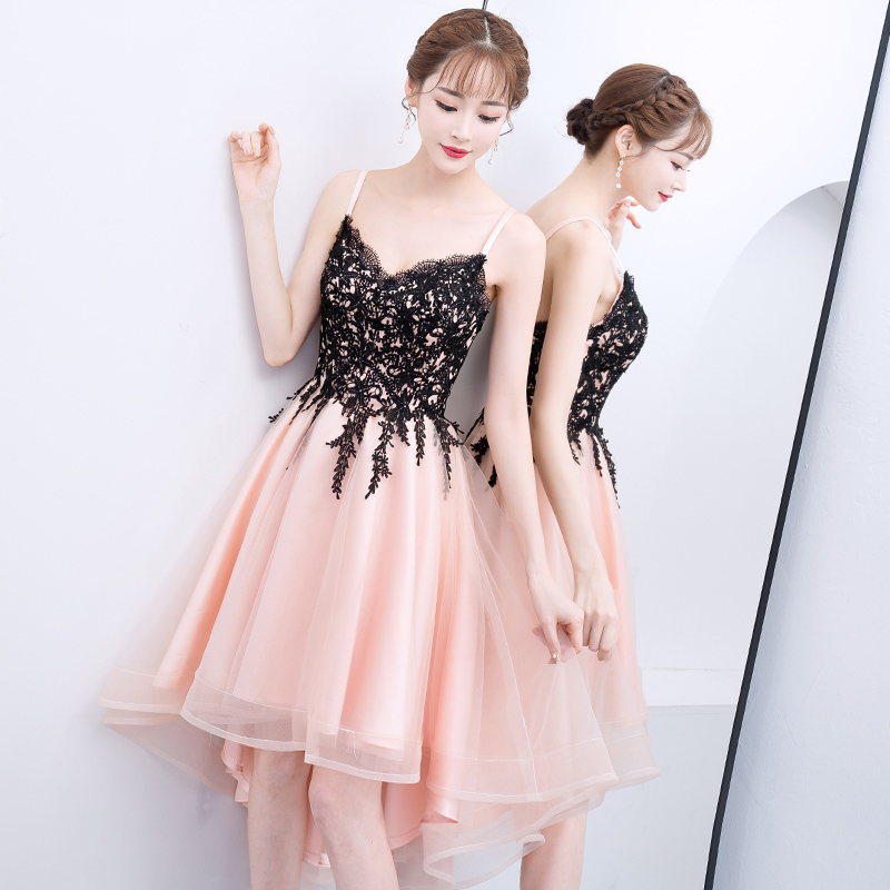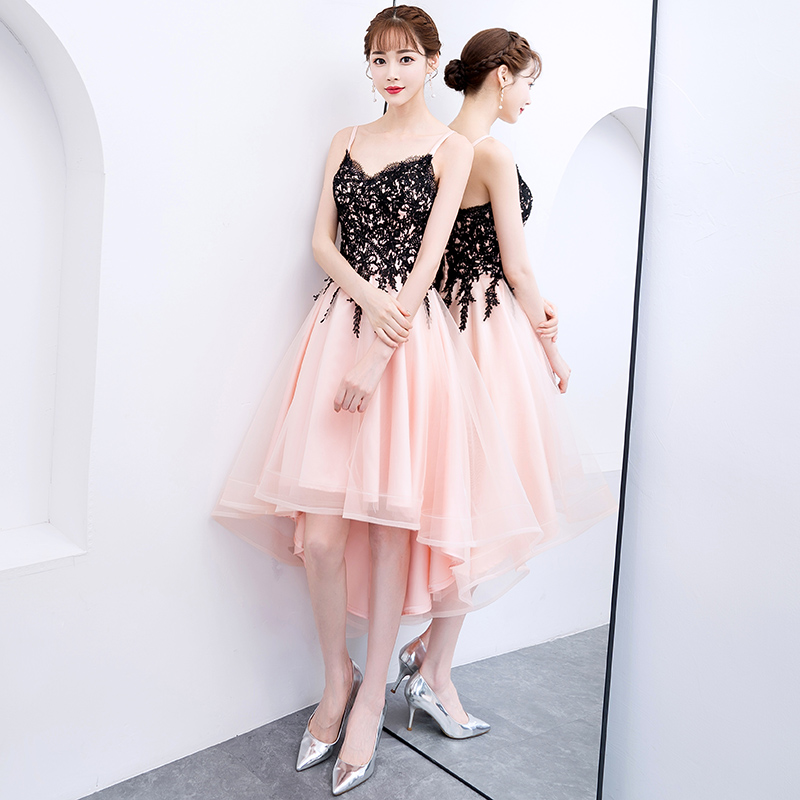 - Pink v neck tulle lace high low prom dress, homecoming dress -