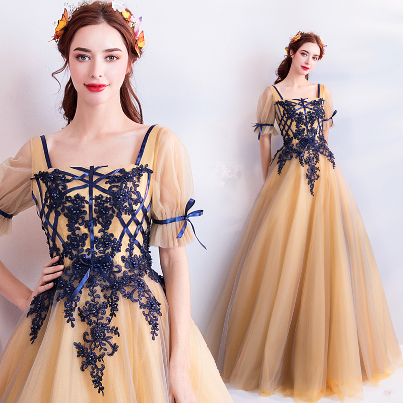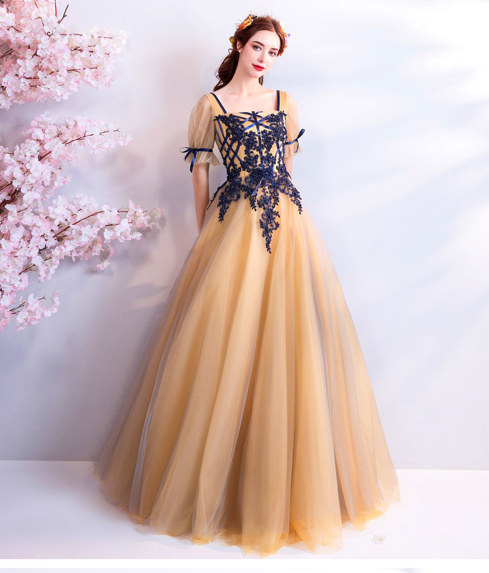 - Champagne tulle lace long prom dress, evening dress -
