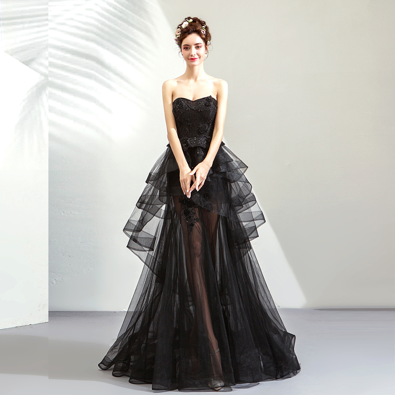 - Black sweetheart neck tulle long prom dress, black evening dress -