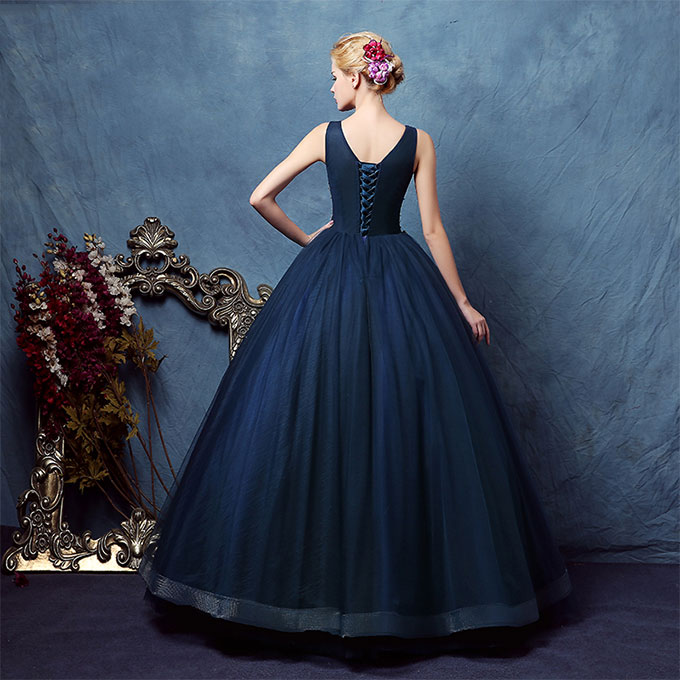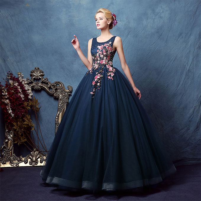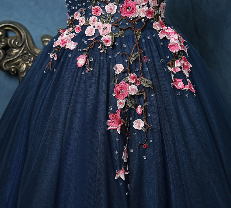 - Dark blue tulle applique long prom dress, evening dress -