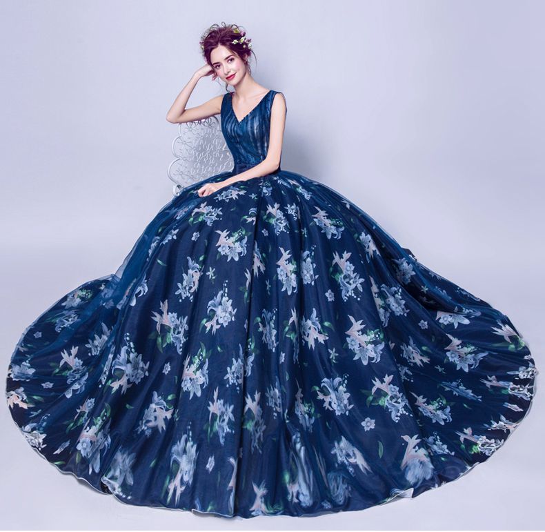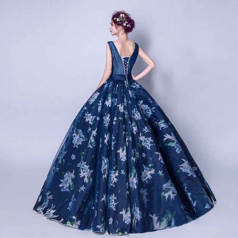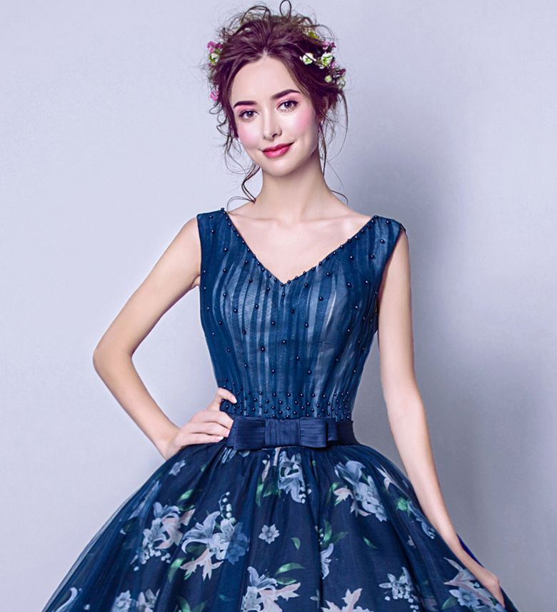 - Dark blue v neck floral pattern long prom dress, evening dress -