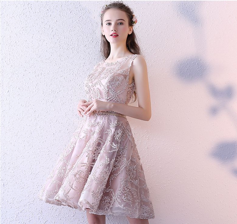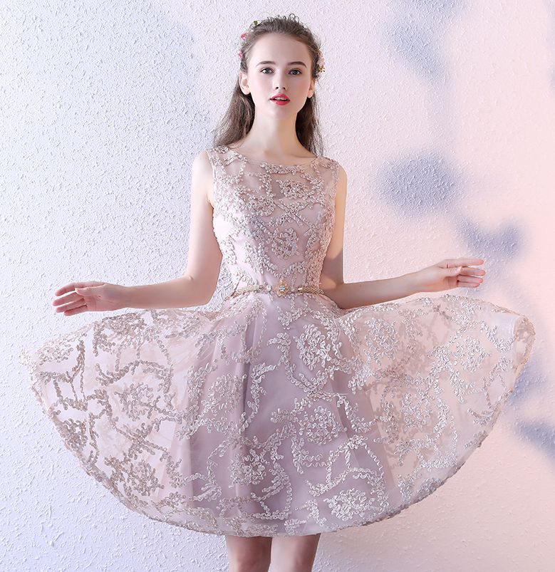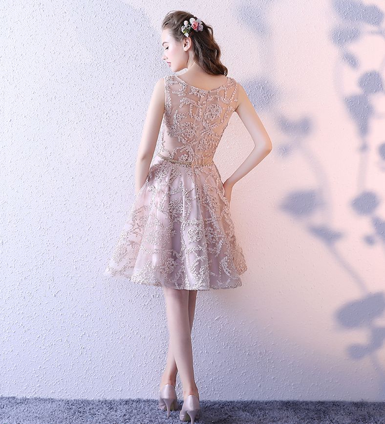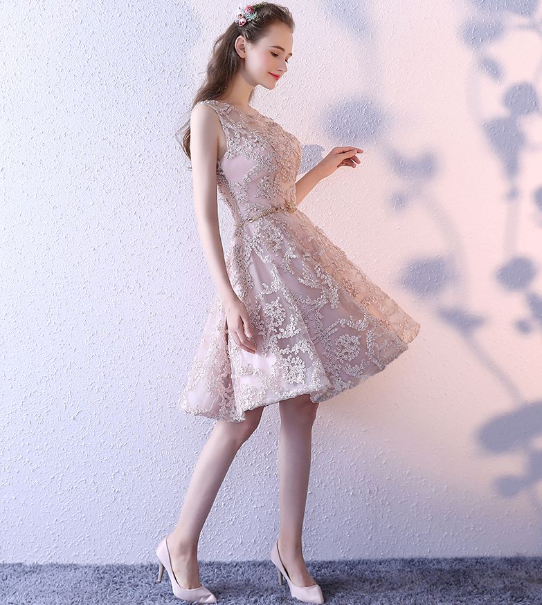 - Cute champagne round neck short prom dress, homecoming dress -