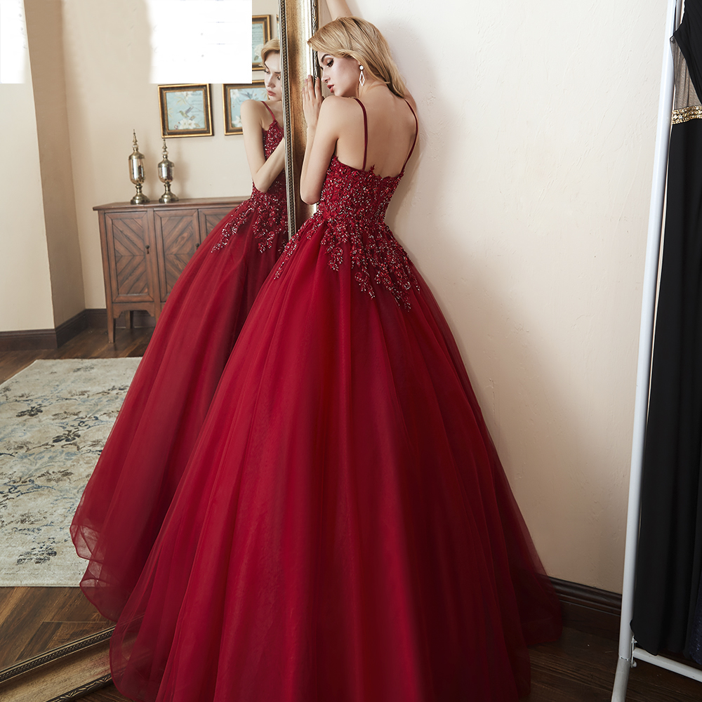 - Burgundy v neck tulle beads long prom dress, sweet 16 dress -