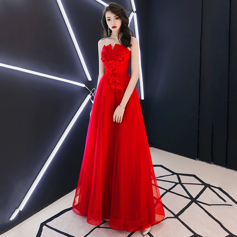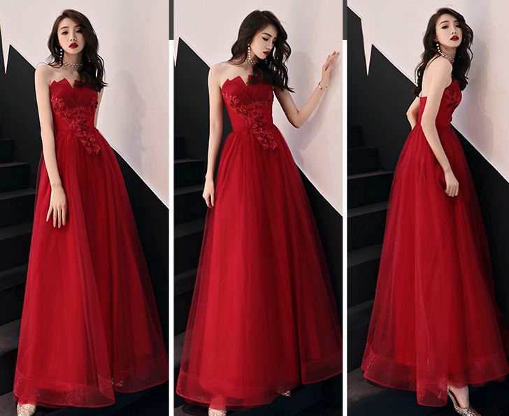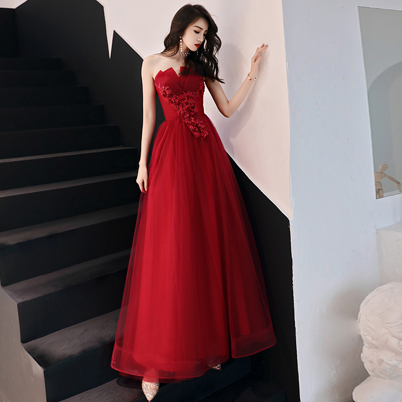 - Burgundy strapless tulle lace long prom dress, evening dress -