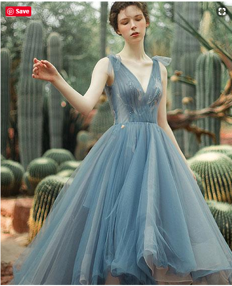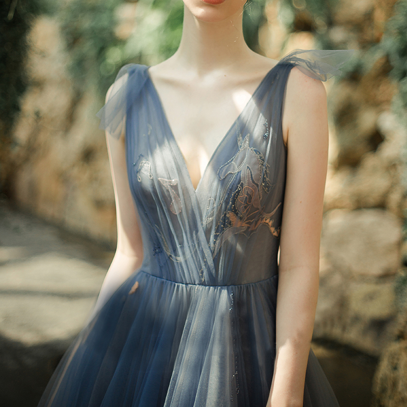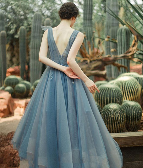 - Blue v neck tulle short prom dress, blue evening dress -