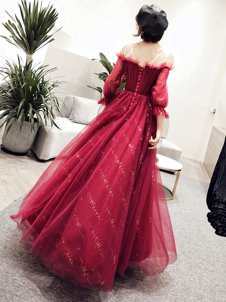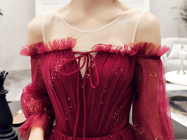 - Stylish burgundy tulle long prom dress, evening dress -