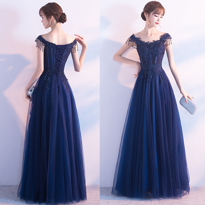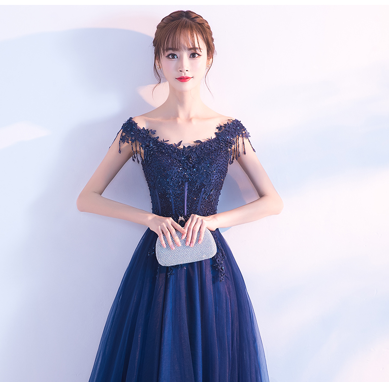 Dark blue tulle beads long prom dress, evening dress
