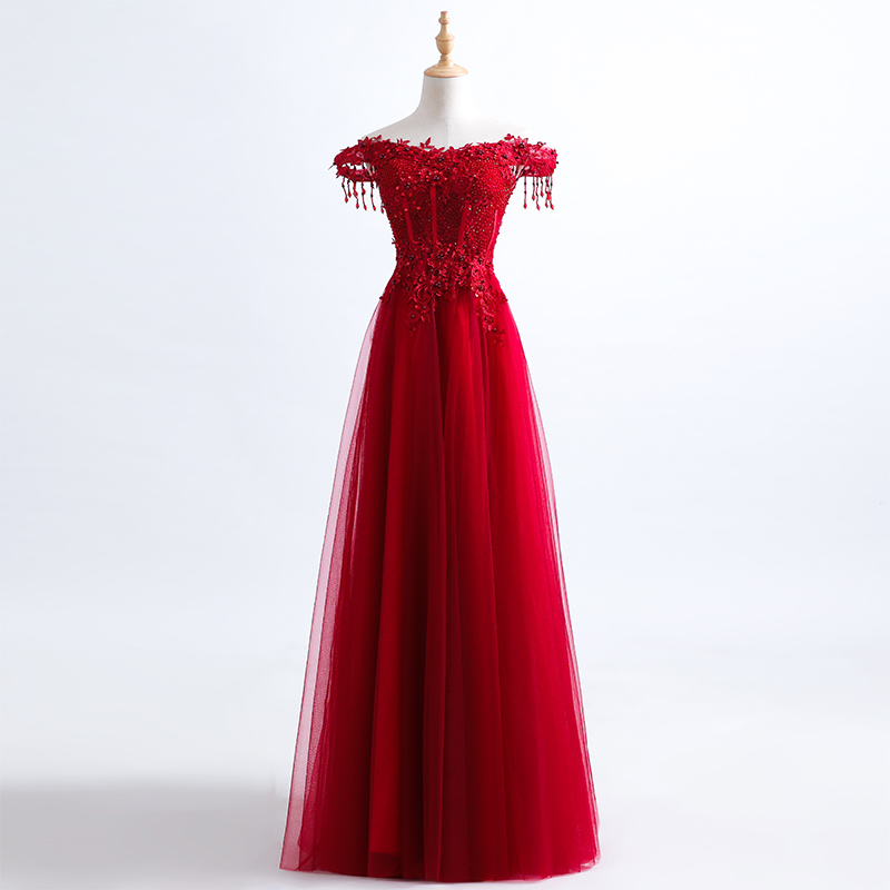 - Dark blue tulle beads long prom dress, evening dress -