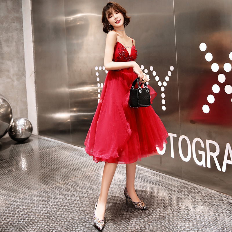 - Burgundy v neck lace short prom dress, homecoming dress -