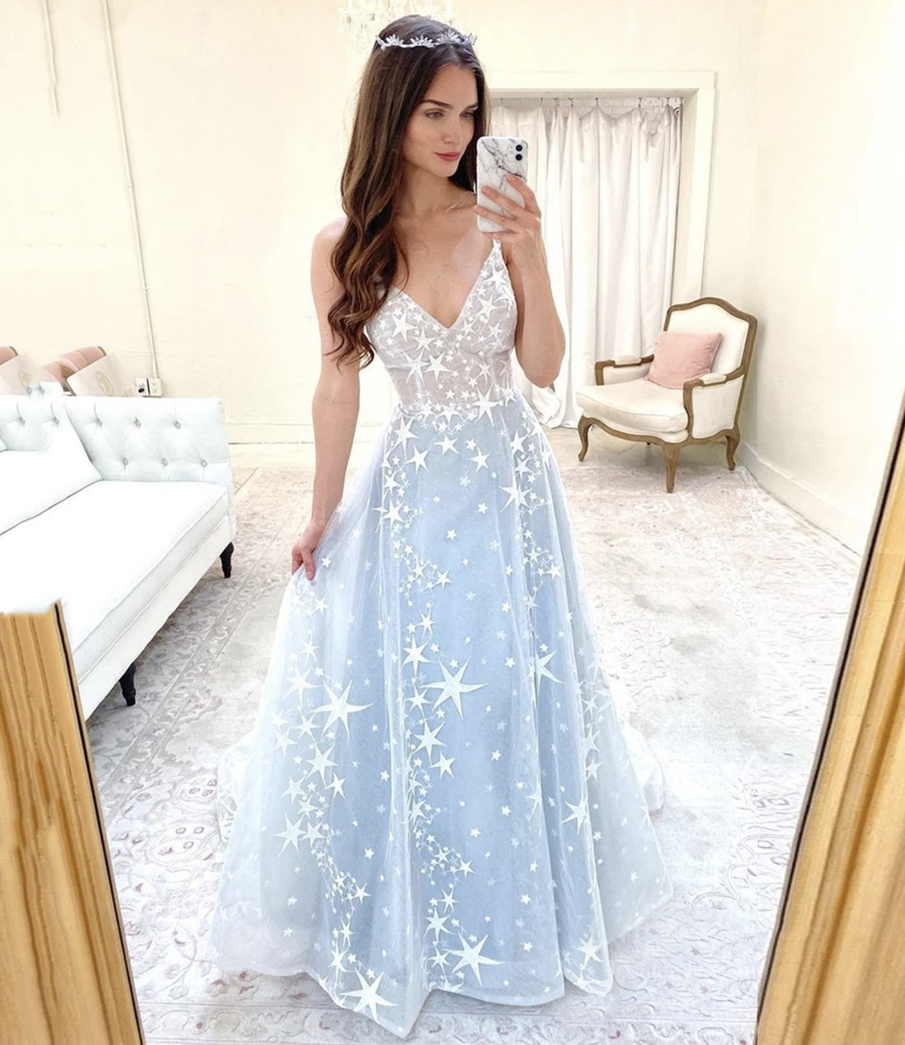 - Blue v neck tulle long prom dress A line evening dress -
