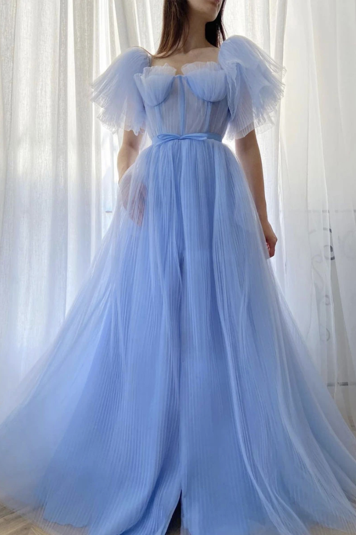 - Blue tulle long A line prom dress blue evening dress -