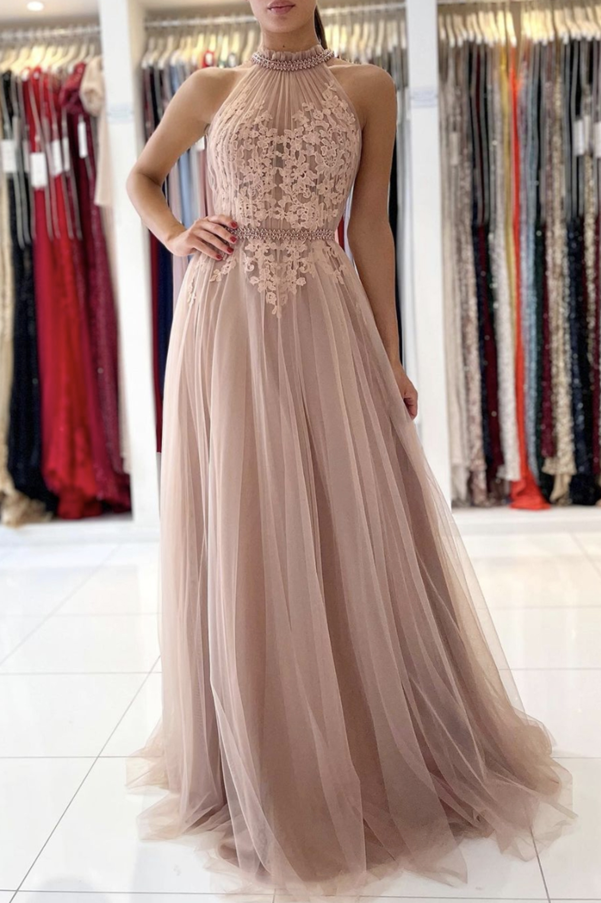 Cute lace long A line prom dress evening dress