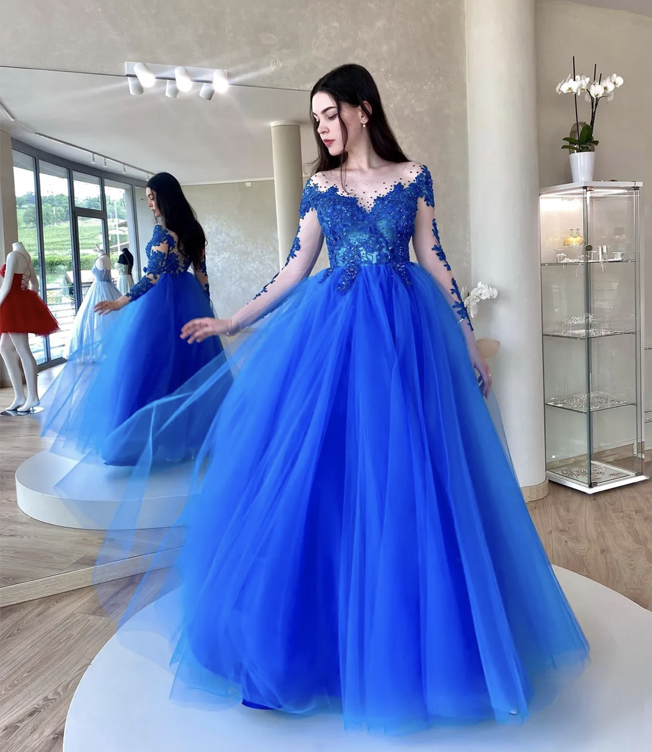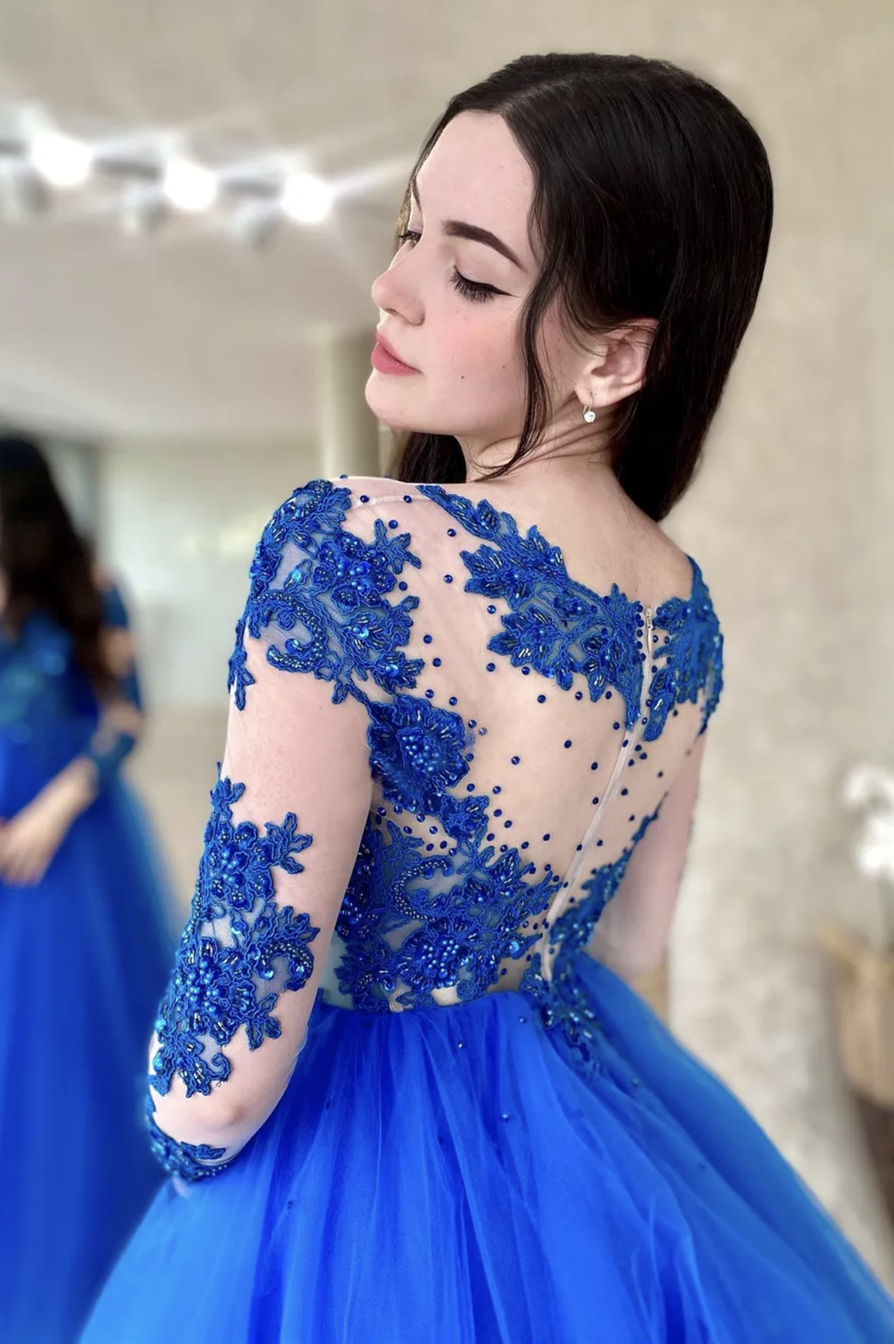- Blue tulle lace long prom dress blue evening dress -
