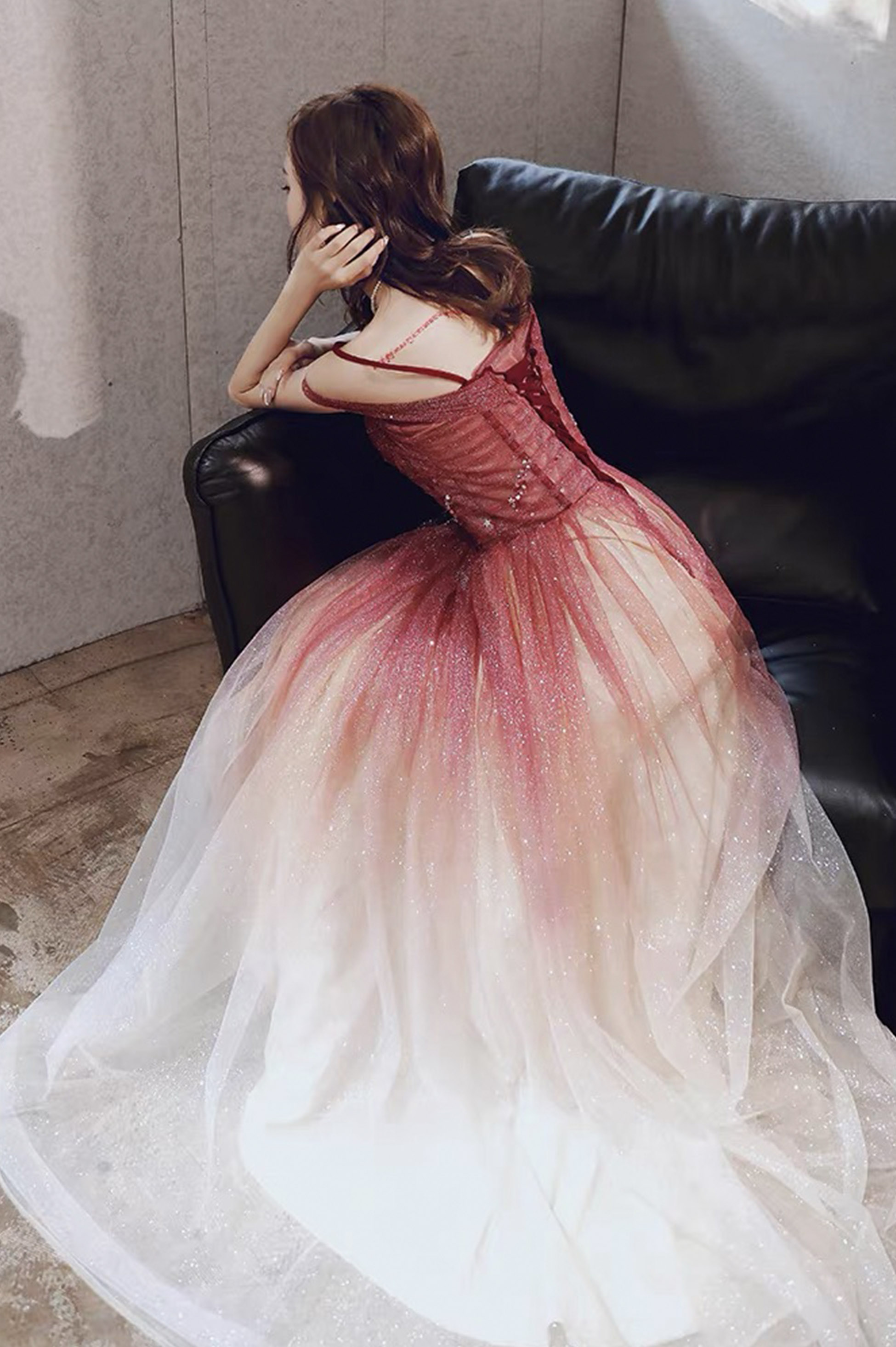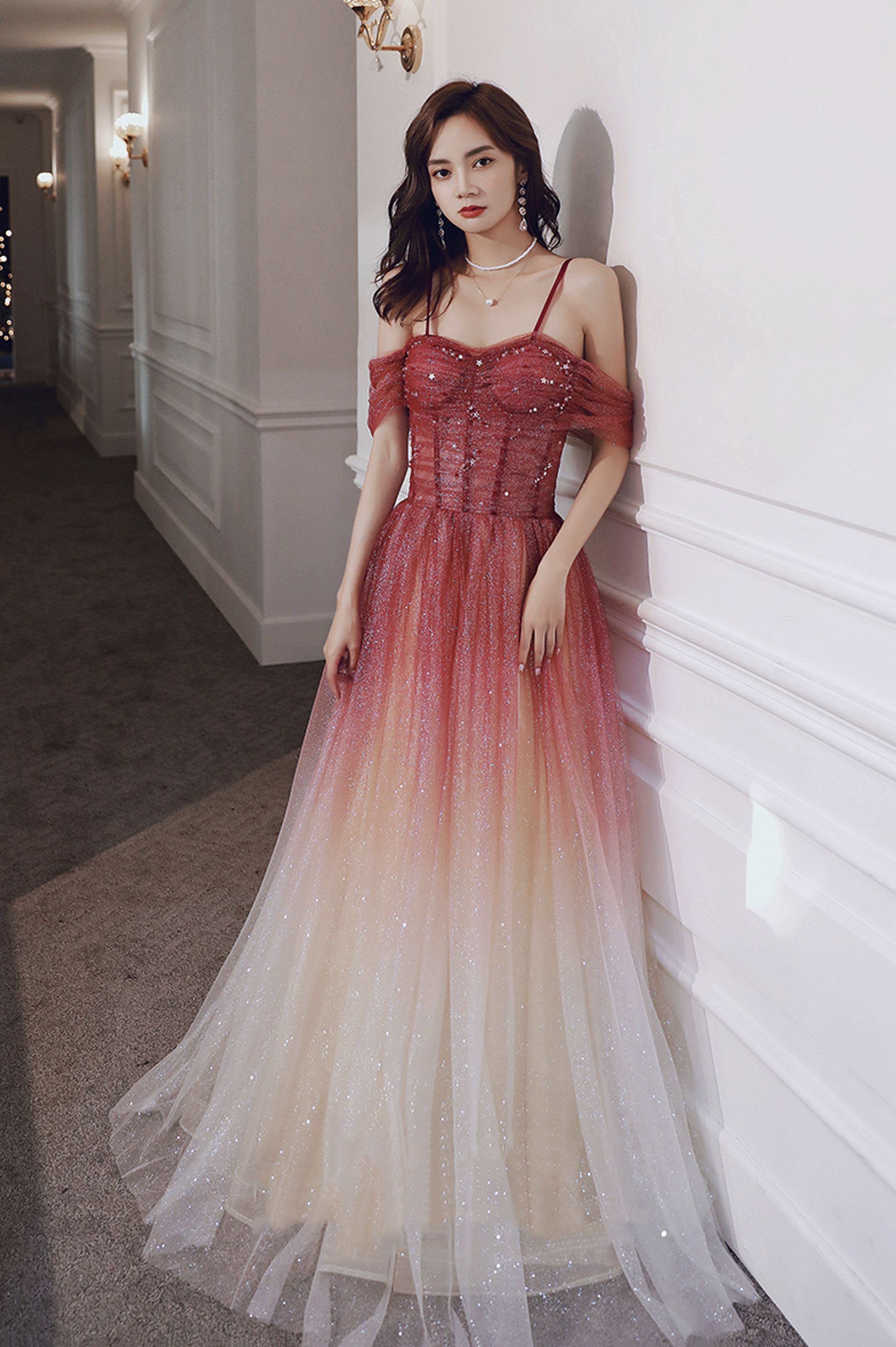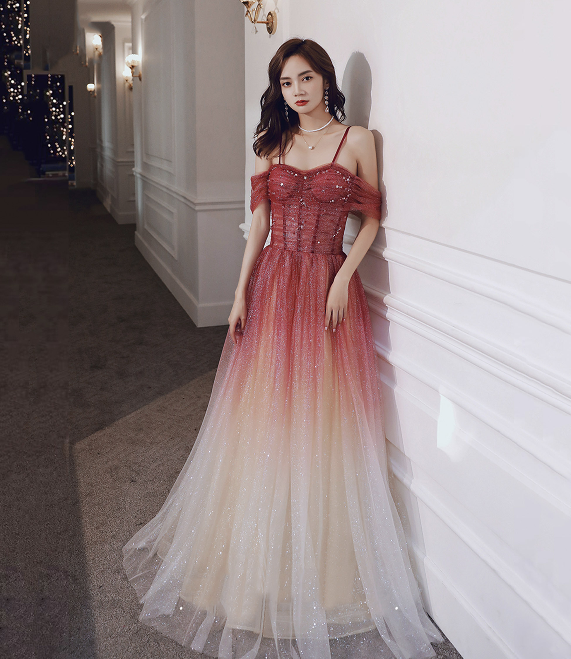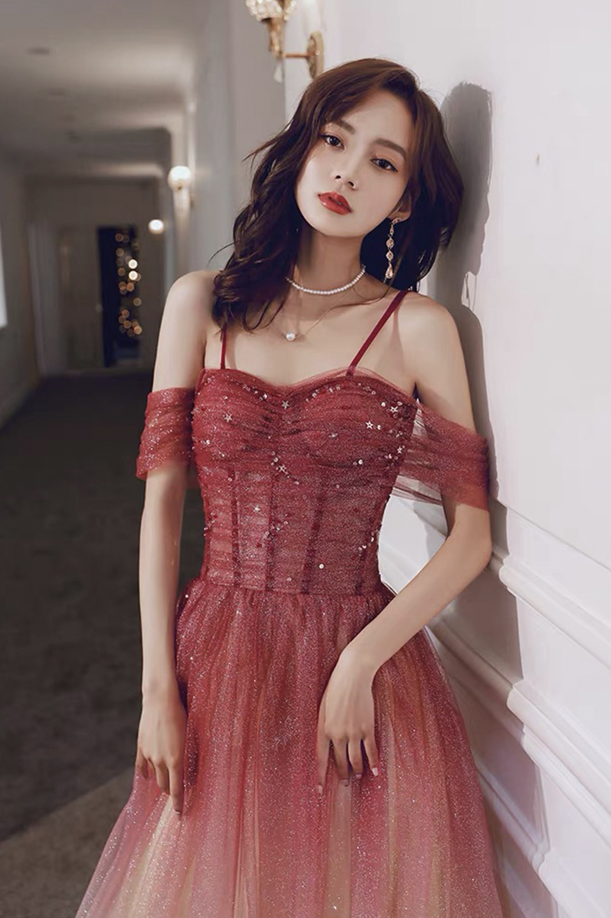 - Burgundy tulle sequins long prom dress evening dress -
