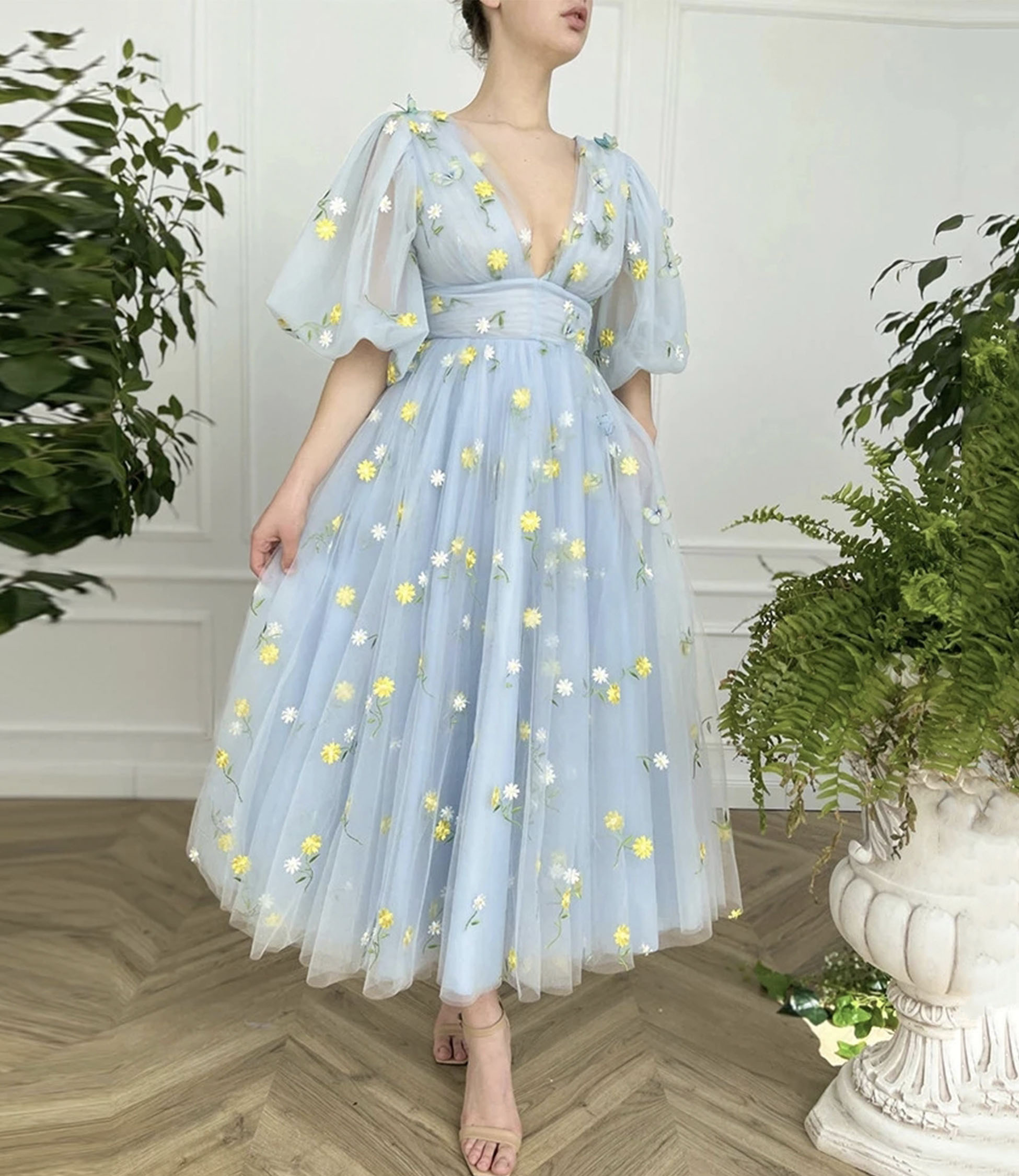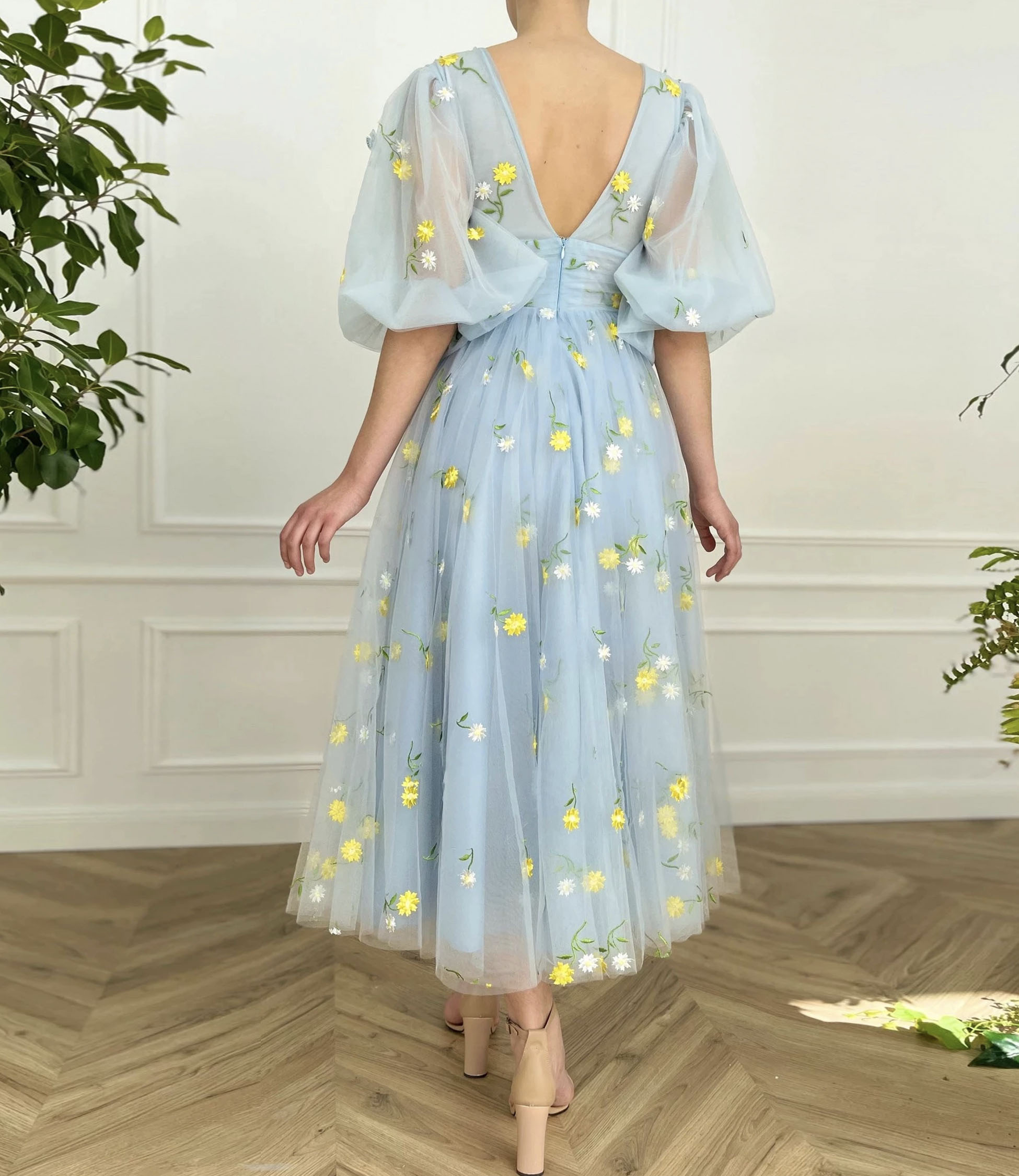 - Blue tulle lace short prom dress A-line evening dress -